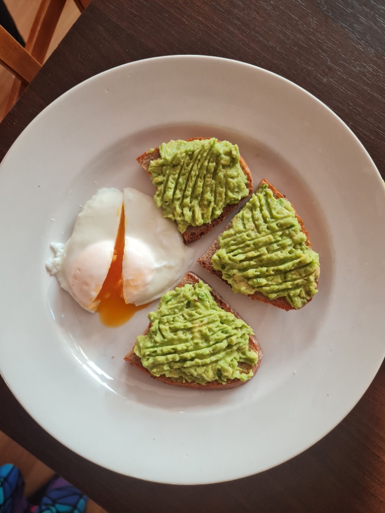 Vzhledem k tomu, že avokádo už bylo krásně vyzrálé a jsem jediná v rodině, kdo ho jí, pustila jsem se nejdřív do něj. Udělala jsem si jednoduchý avokádový toast s trochou extra panenského olivového oleje, špetkou soli, pár kapkami citronu a k tomu svoje úplně první pošírované vejce.